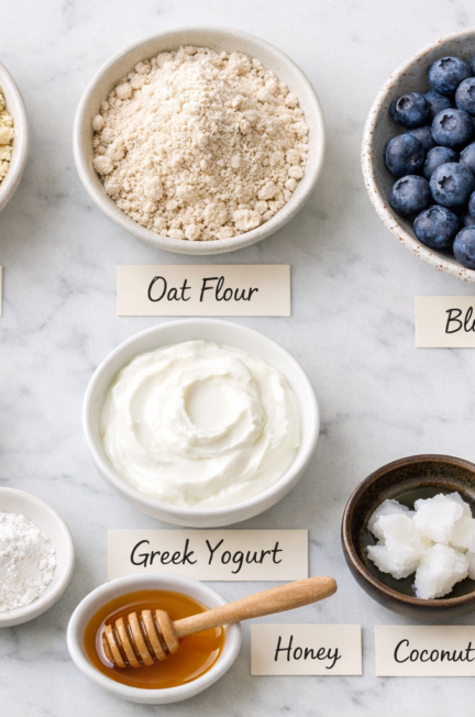 () editorial food photography showing a flat-lay overhead shot of gluten-free blueberry muffin ingredients neatly arranged